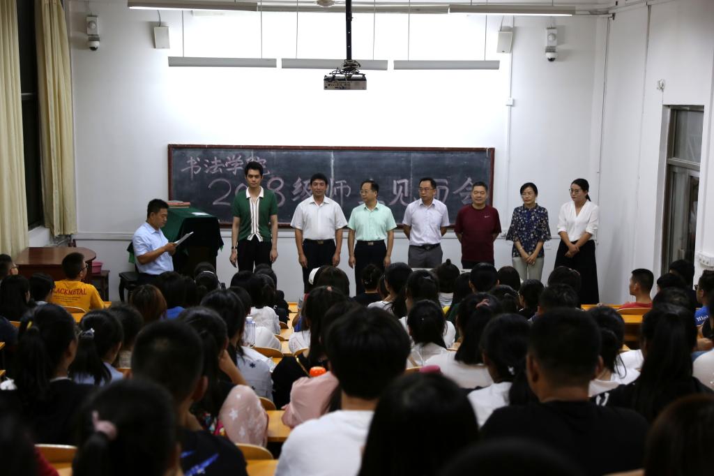 9月9日晚七点,我院在101教室举行了2018级师生见面会。书法学院党委书记姜晓强、副院长陈涛、党委副书记胡乃永以及专业指导老师朱乐朋、侯颖慧、徐可然、刘禹鹏出席了见面会。见面会由杨玉强主持。