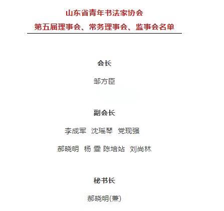 大会审议通过了山东省青联常委、山东省青年书法家协会第四届理事会主席于剑波所作的题为《团结协作,勇于担当,续写山东青年书法事业新篇章》的工作报告,审议通过了新的《山东省青年书法家协会章程》,选举产生了山东省青年书协第五届理事会、常务理事会和监事会。其中我院陈培站老师当选为山东省青年书协第五届理事会副会长。