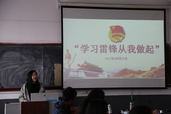 活动首先由4班团支书朱英浩围绕“什么是雷锋精神”、“雷锋精神的现实意义”等问题展开。同学们就这些问题进行讨论,并发表了自己的见解。随后,她为同学们讲述雷锋事迹,解读了雷锋精神,以及雷锋精神的现实意义和如何弘扬雷锋精神,指出雷锋精神已经成为我们这个时代精神文明的同义词、先进文化的象征。