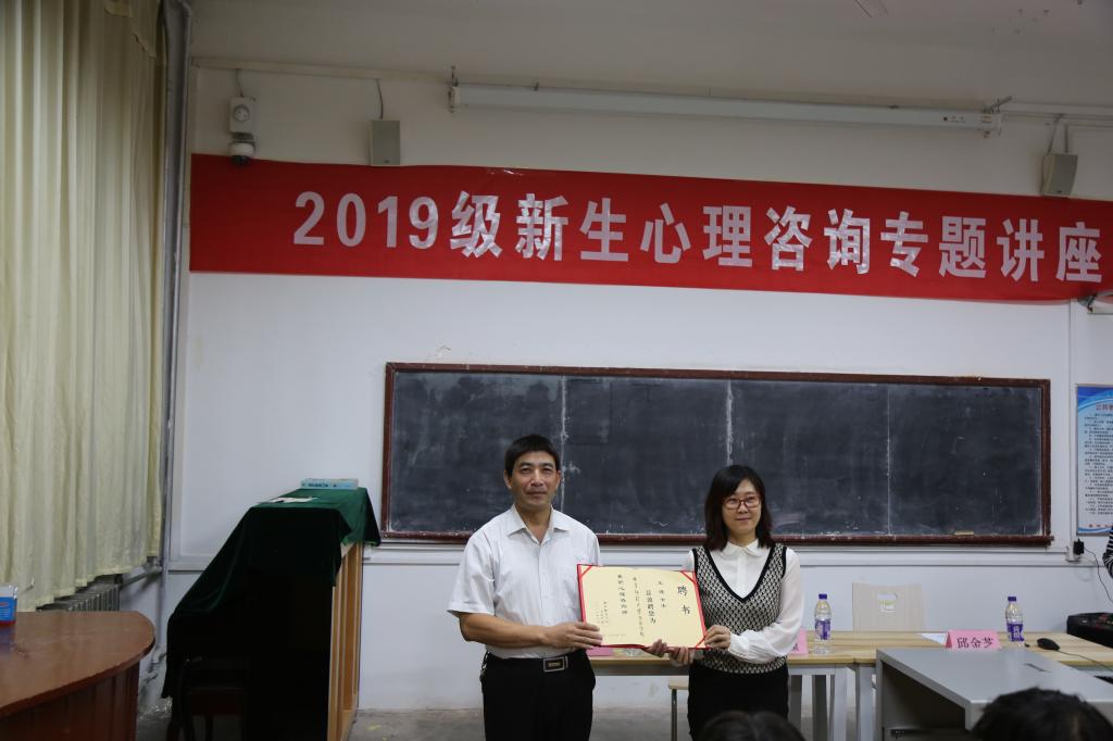 为提高同学们对心理健康教育的认识,更好地促进同学们的身心健康发展。9月20日晚上7点,我院特邀国家二级心理咨询师、音乐治疗师王瑾老师,在我院南楼101教室开展“大学,心生活”心理咨询专题讲座。我院特聘王瑾老师为书法学院心理咨询师,党委副书记胡乃永为王老师颁发聘书。本次讲座由我院本科生辅导员邱金芝主持,2019级全体新生参加了活动。