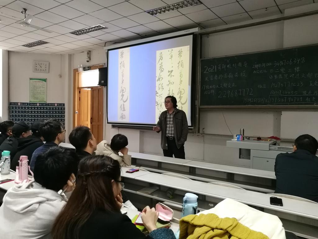 讲座上,陈国成教授就“书法临摹的无效性”这一背景展开讲述。陈国成教授指出,当今书法的最大难题在于古法的丢失,这也成为当今学术的最大难题。围绕这一现象,陈教授通过“等粗行进”、“钩的驻提”、“撇的直挺”、“起与收”等几个模块进行讲述,讲座主题突出、思路清晰、内涵丰富,具有很强的系统性、针对性、指导性。在场学生认真倾听,并做好学习记录。