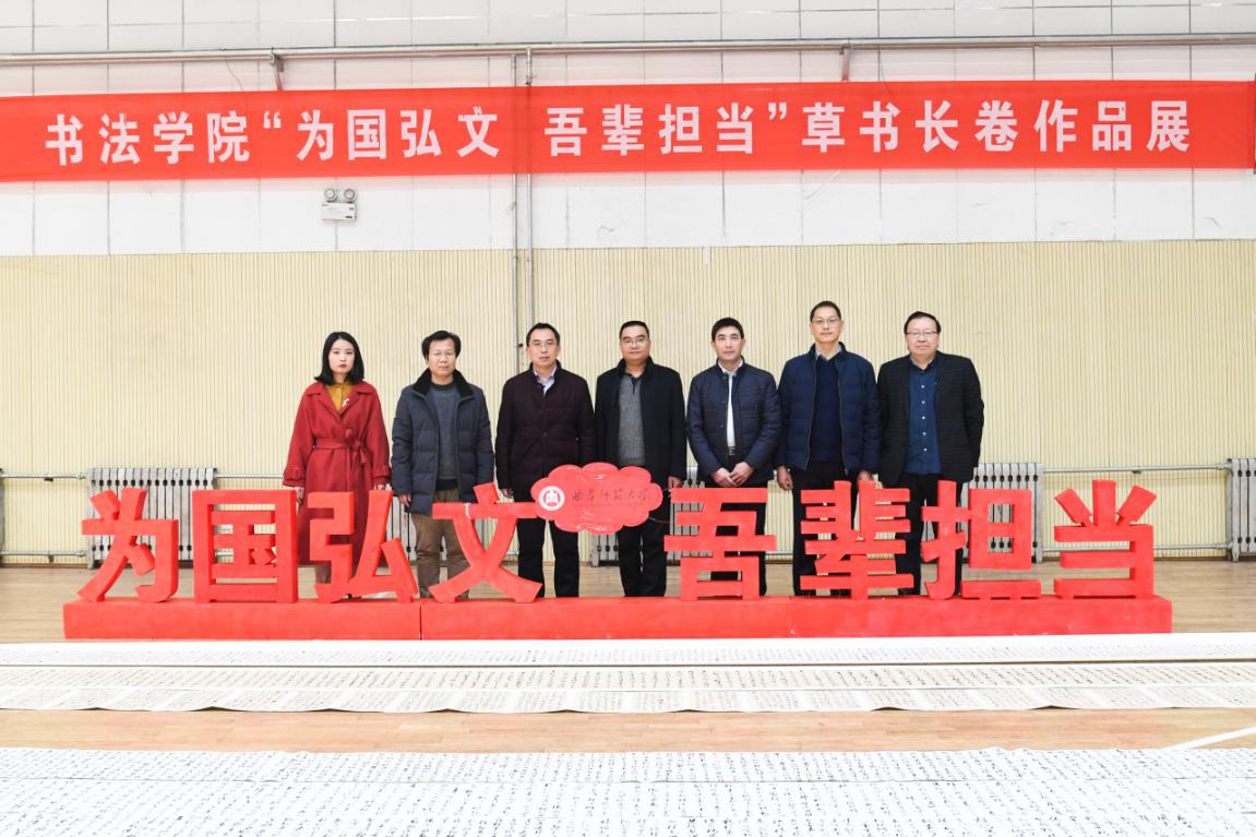在习近平总书记视察曲阜6周年重要讲话之际,我院特举办“为国弘文,吾辈担当”草书长卷作品展活动,旨在落实“文化立校”战略行动计划,全面展示我校第八次党代会以来在推进中华优秀传统文化“创造性转化、创新性发展”的工作成果,彰显“为国弘文”的初心使命和时代担当;更是学院党委为落实“不忘初心、牢记使命”主题教育的行动体现。