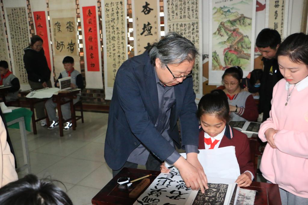 授牌仪式结束后,我院师生来到大厅为二附小现场书写的小同学进行指导和示范。在热火朝天的书会中,乌峰教授提笔为二附小留下墨宝,我院实习学生也先后留下作品,展现了我院学子优秀的专业素养以及一个月来的实习成果。