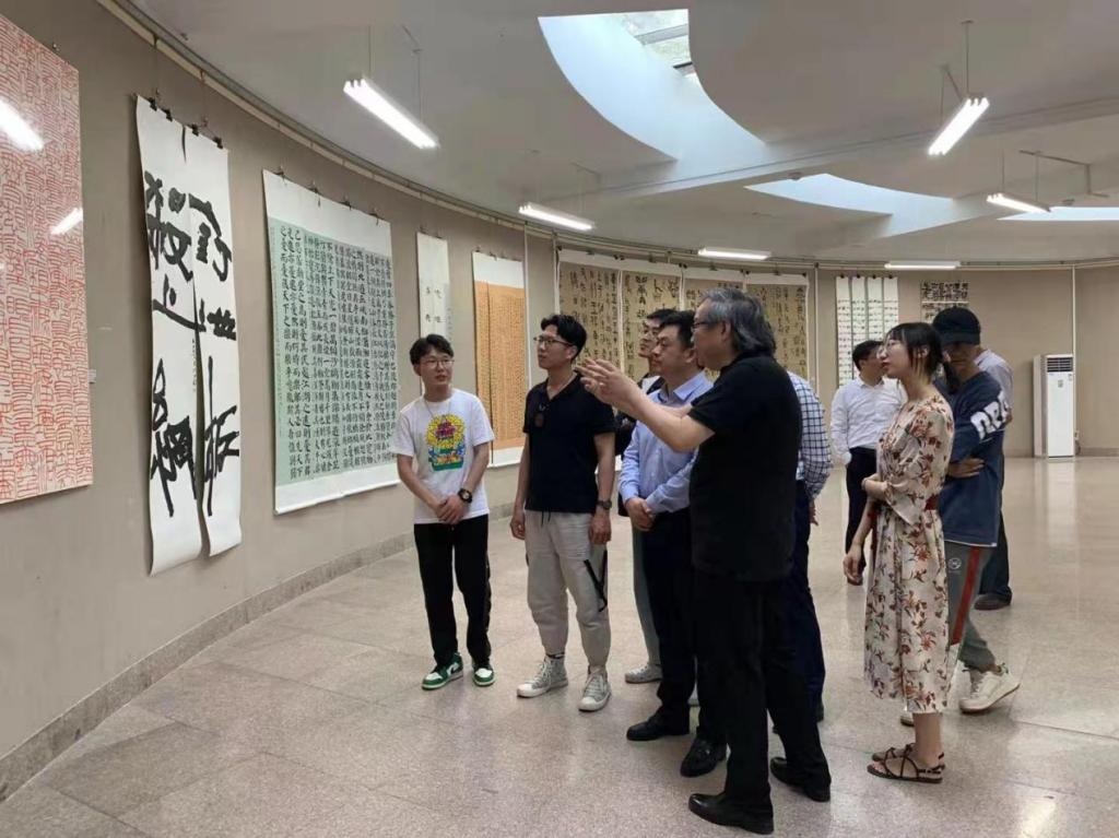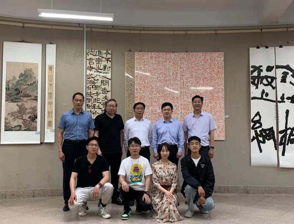 2021年5月29日下午曲阜师范大学党委书记戚万学教授,副校长胡钦晓教授在学院党委书记荆兆清、院长助理乌峰教授、党政办公室主任刘育华的陪同下参观了书法学院2021届本科毕业生唐演、尹柯宇、张方琨、冯乐乐共同举办的《振鹭于飞》书画篆刻联展,并与在场的同学们进行了亲切交谈。在观展过程中同学们倍感荣幸,四位同学逐个详细的向各位领导介绍了自己展览作品的内容以及创作历程,并就书法学习创作过程中的诸多问题进行了深入的交流,学校领导认真耐心的对同学们展示的作品进行逐个分析,并提出了诸多角度的建议,在场所有观展的同学们受益良多,他们以自己严谨渊博的学识和深厚宽宏的审美意识与对学生殷切关怀的态度令在场的诸多同学动容,也使得各位同学对书法专业学习有了更高的认识。