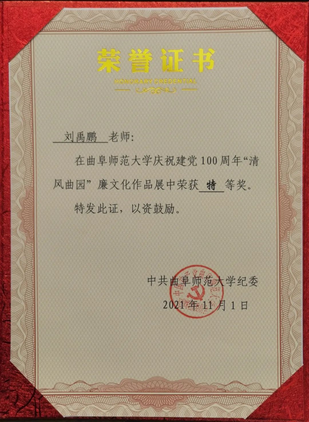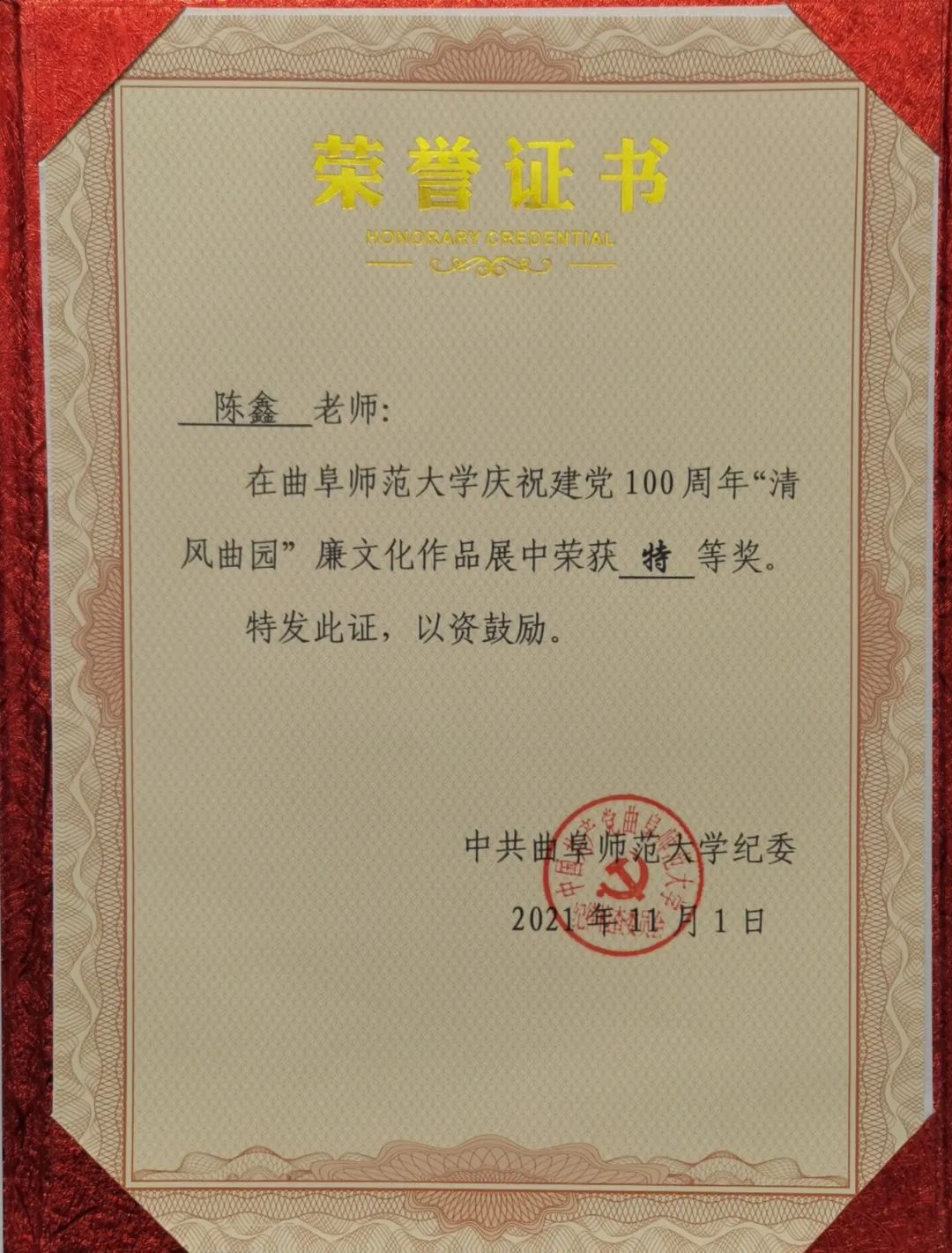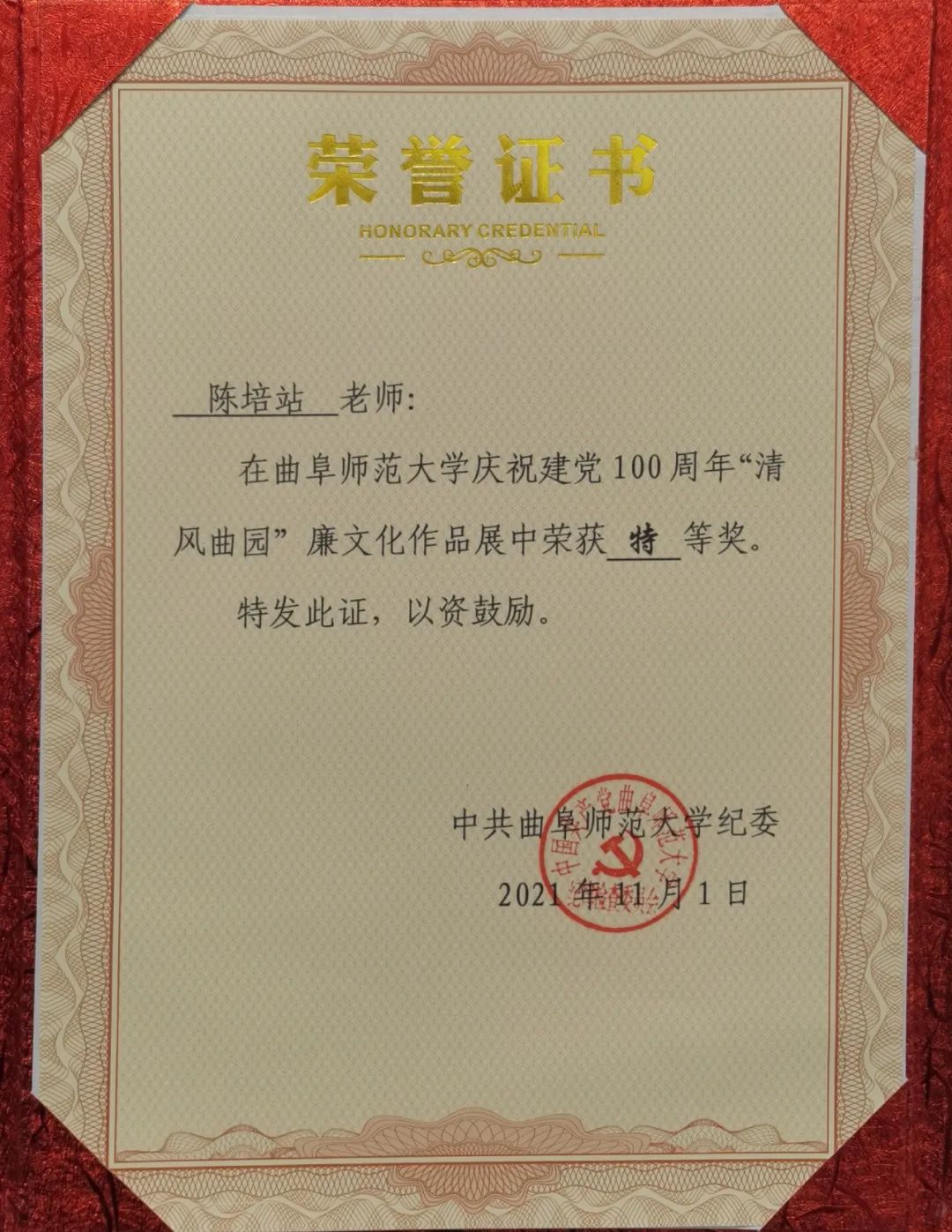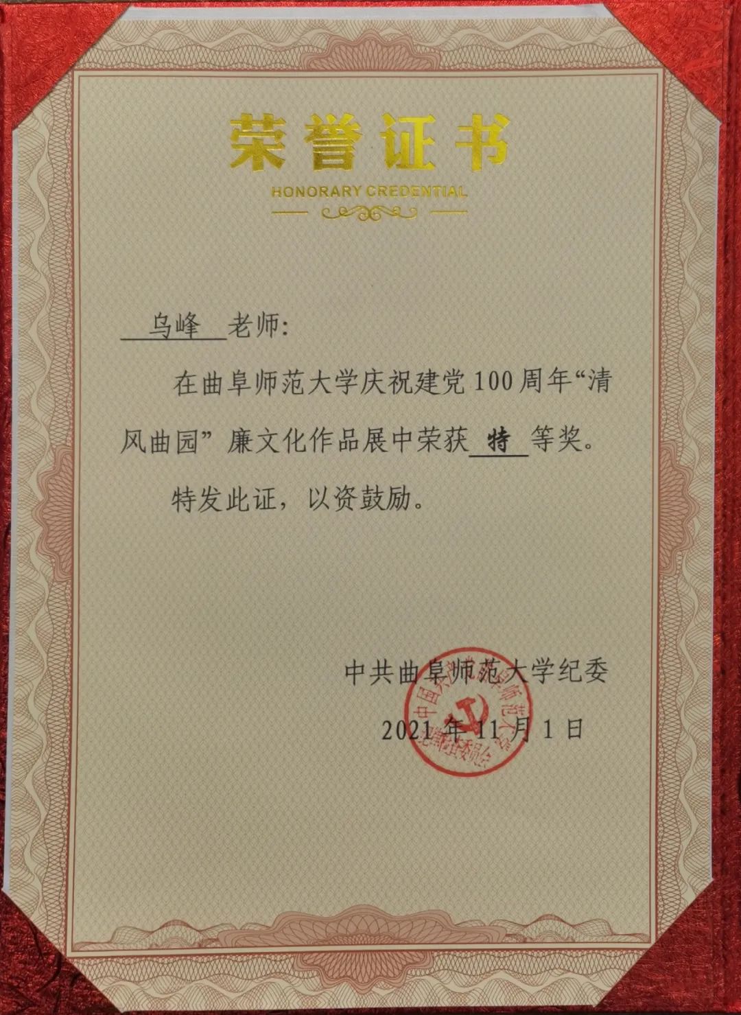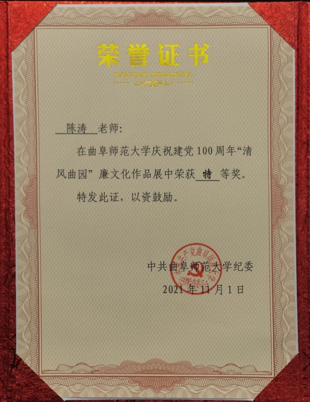 近日,“清风曲园”廉文化作品展评选结果公布。我院荣获“清风曲园”廉文化作品展优秀奖组织奖。学院党委书记、院长刘建新,教师乌峰、陈培站、陈涛、孙钢、陈鑫、张兢兢、徐可然、刘禹鹏在“清风曲园”廉文化作品展中荣获特等奖。